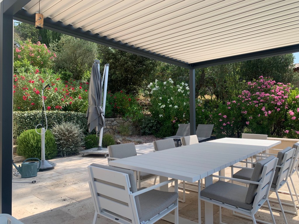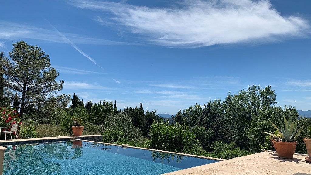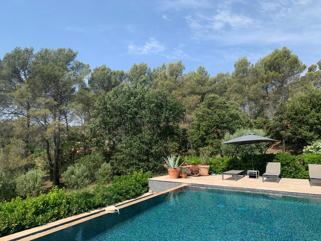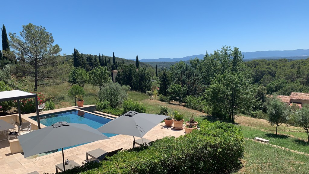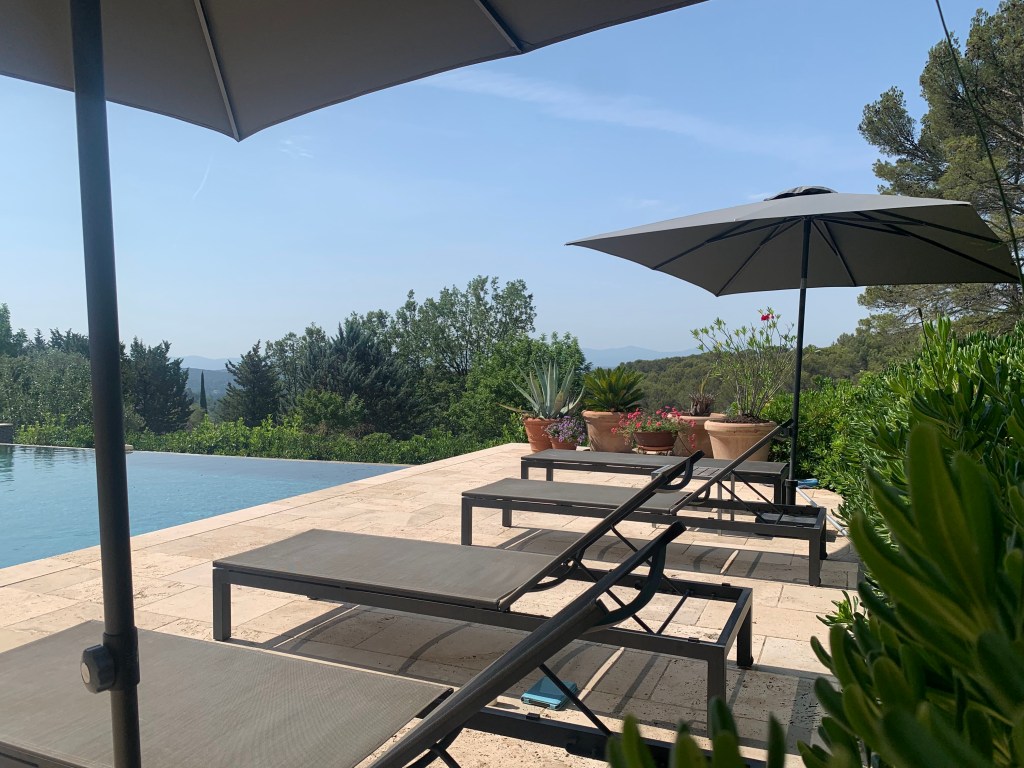 De villa ligt op een ruim terrein over verschillende hoogteniveau’s en zgn. restanges (terrassen). U wordt omringd door Provencaalse planten en bomen: eiken, pijnbomen, platanen, moerbeien, olijfbomen, fruitbomen, oleanders, jasmijn, cactussen, kruiden en bloemen. Hier kunt u heerlijk genieten van een ruime infinity pool waar je veilig in kunt duiken. Wie het hoofd graag droog houdt, loopt via een van de trappen het zwembad in. Rondom het zwembad zijn ligbedden en parasols en je kunt hier ook lunchen of dineren aan de ruime tafel met verstelbare pergola. De tuin aan de zwembadzijde ligt op het zuiden met het schitterende uitzicht. Er zijn ook beschutte plekjes onder de bomen of bij de bloemenborders in de buurt. In elk seizoen is wel ergens een zon- èn een schaduwplek te vinden.